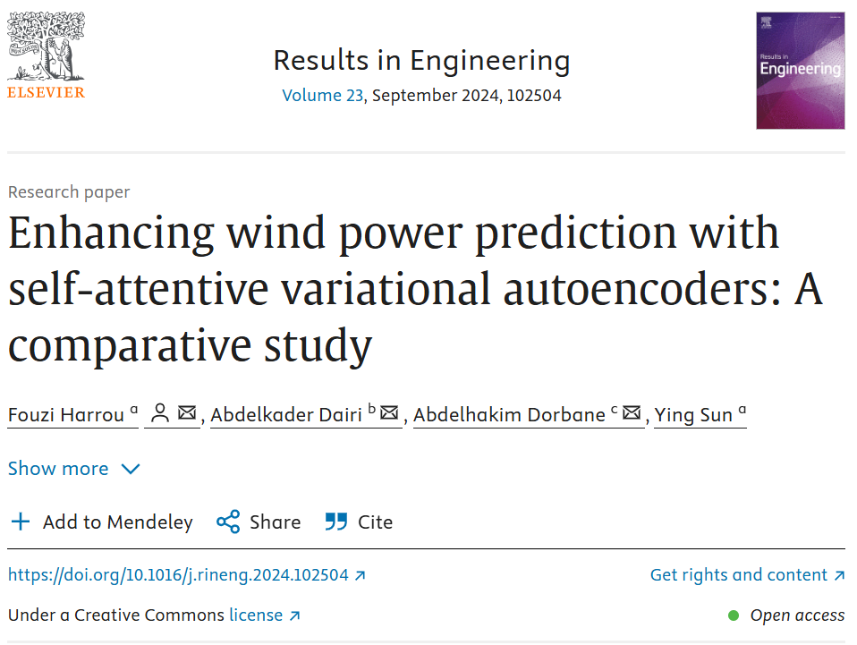 随着全球风电装机容量突破 900GW,准确的风电预测已成为电网稳定运行的关键。但风电受风速、地形等因素影响,输出波动剧烈,传统预测模型常因无法捕捉复杂非线性模式,导致误差居高不下。2024 年,来自沙特阿卜杜拉国王科技大学等机构的团队在《Results in Engineering》期刊发表研究,提出自注意力变分自动编码器(SA-VAE) ,将风电预测平均(R2)值提升至 0.992,远超 LSTM、XGBoost 等主流方法,为风电高效并网提供了新方案。
