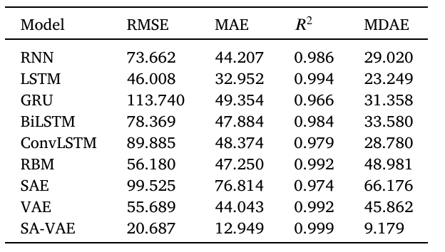 实验结果表明,SA-VAE 的误差分布最集中,MDAE(中位数绝对误差)仅 19.675,比 ConvLSTM 的 35.914 低 45%。这意味着即使遇到 “极端风速”“设备临时故障” 等异常情况,SA-VAE 也能保持稳定预测,不易出现大幅偏差。