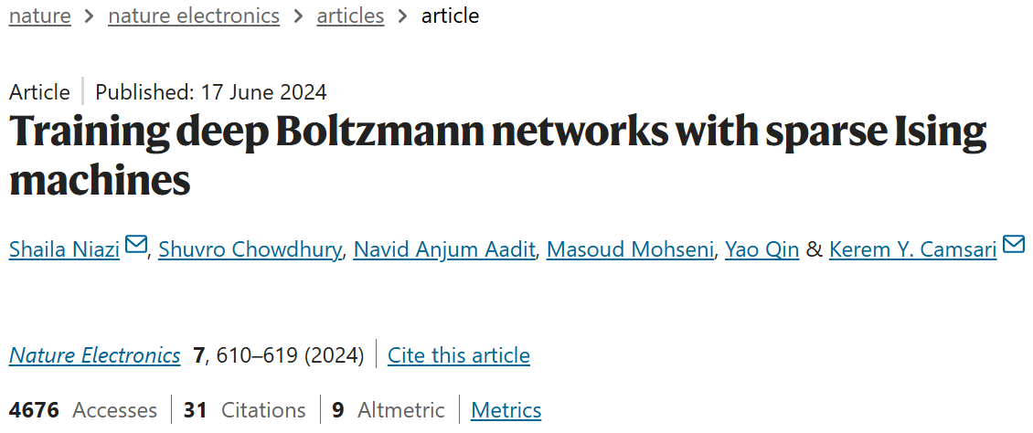 《 Training deep Boltzmann networks with sparse Ising machines 》发表于 Nature Electronics 期刊。文章提出稀疏伊辛机混合计算框架,以 FPGA 实现稀疏伊辛机,采用 Pegasus/Zephyr 拓扑,4264 个 p-bit、3 万参数的稀疏 DBM,在全 MNIST 数据集达 90% 分类精度,与 325 万参数 RBM 持平,还能生成RBM 无法实现的手写数字。其采样速度 50-64 十亿次翻转 / 秒,比 GPU/TPU 快至少一个量级,为深度生成模型提供轻量化方案。