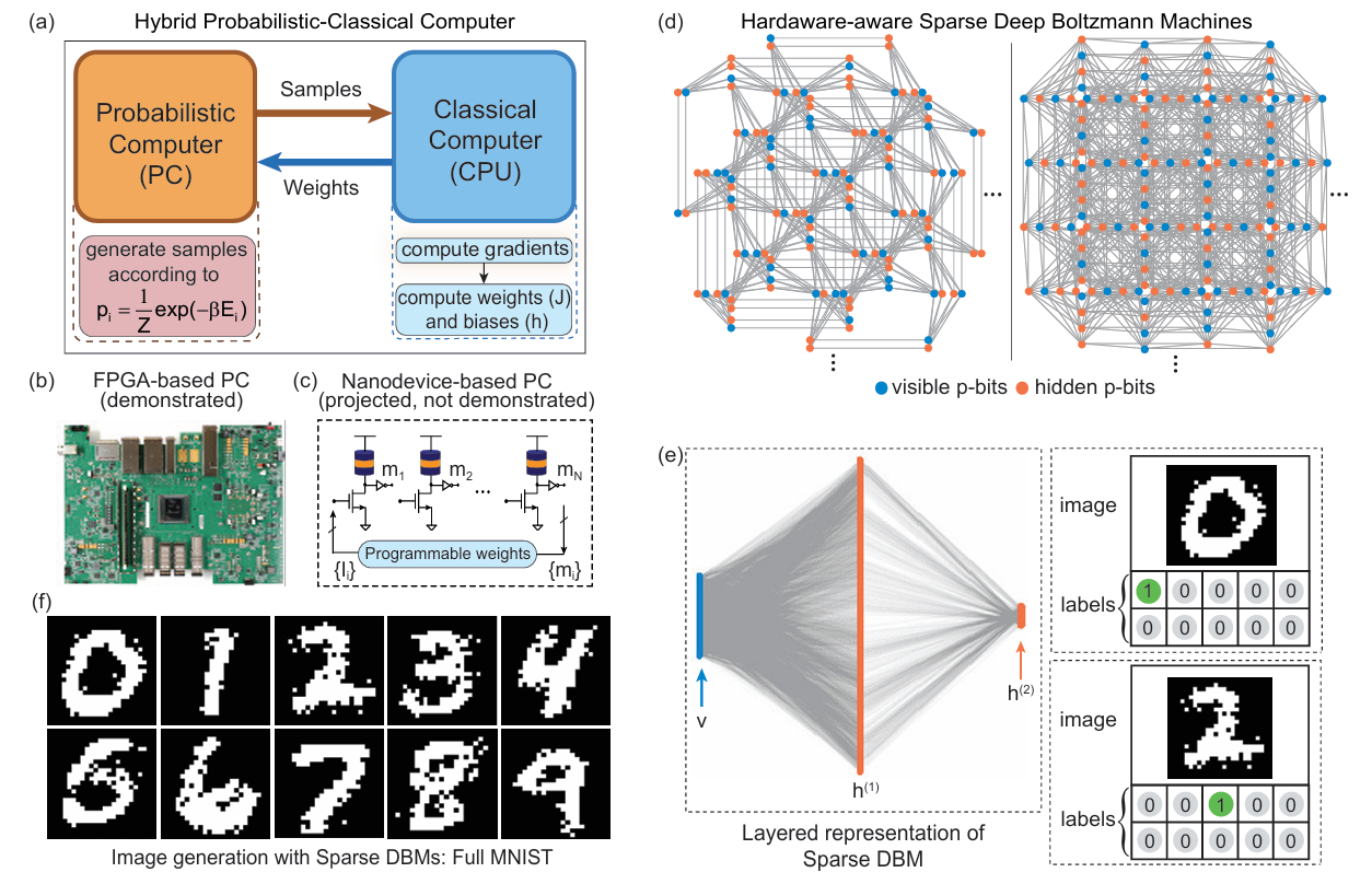 当深度学习还在依赖 GPU/TPU 处理海量参数时,加州大学圣塔芭芭拉分校等团队开辟了新路径 ——2024 年在相关研究中提出基于稀疏伊辛机的混合计算框架,用仅 4264 个概率位(p-bit)、3 万参数的稀疏深度玻尔兹曼网络(DBM),在全 MNIST 数据集上实现 90% 分类精度,与 325 万参数的优化限制玻尔兹曼机(RBM)持平,且能生成新手写数字。更关键的是,其采样速度达 50-64 十亿次概率翻转 / 秒,比 GPU/TPU 实现快至少一个量级,为深度生成模型训练提供了 “轻量化 + 高速化” 新方案。