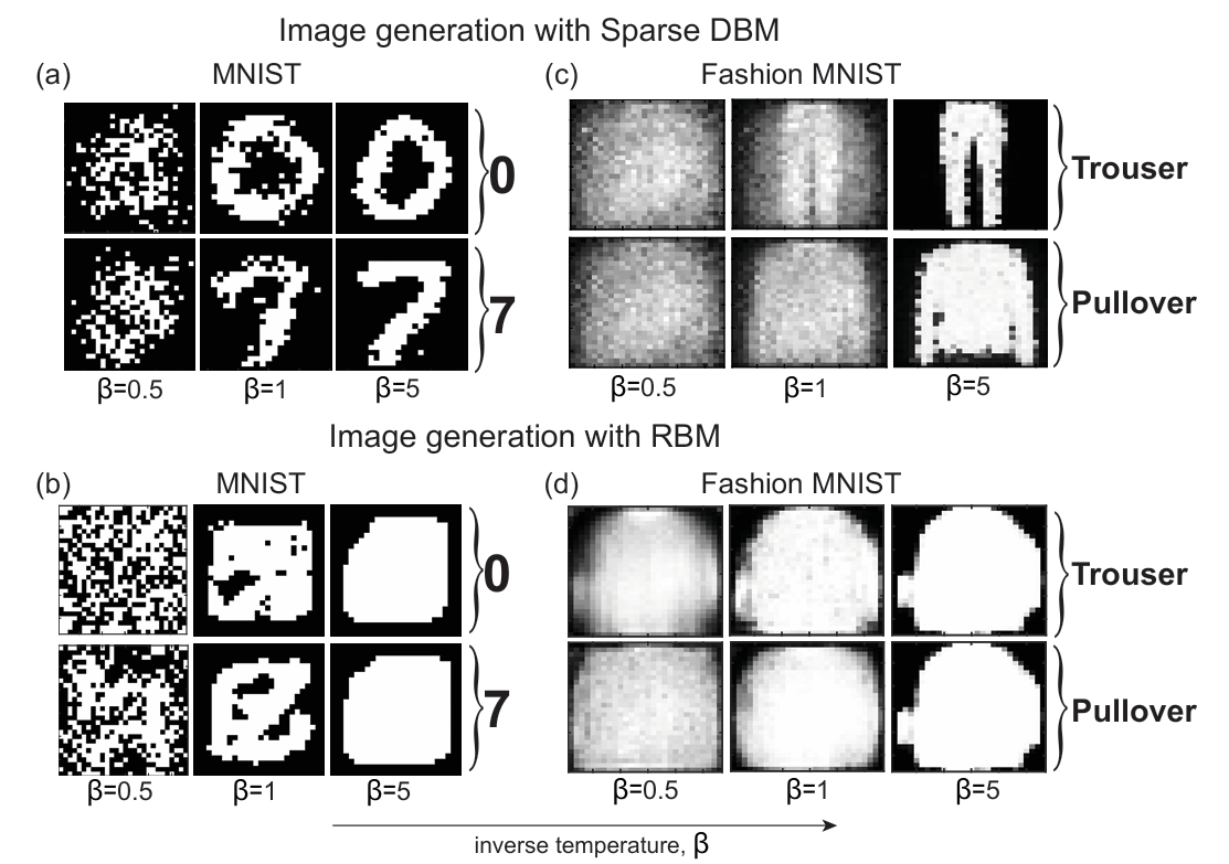 传统 RBM 虽能分类,却无法生成图像;而稀疏 DBM 通过 “标签钳位 + 温度退火”(从 β=0 到 β=5 逐步升温),可生成清晰的手写数字(图2):
