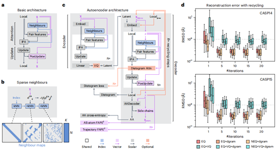 模型架构基于稀疏等变变换器(图1a),通过限制每个残基的注意力计算至其局部邻居(图1b),将复杂度从O(N²)降至O(N·K)。该架构采用IPA层和GeGLU前馈层,直接更新原子位置并动态计算框架以保持等变性。在PDB数据上训练的自编码器模型(图1c)验证了其有效性:所有变体在CASP14/15测试集上经少量迭代即可实现<1Å的重建精度(图1d),最终选定无需距离图邻居的等变版本作为基础架构。