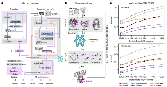 SALAD模型通过训练去噪扩散模型来生成包含主链和侧链原子的全原子结构(图2a),其推理过程通过迭代去噪实现(图2b)。模型引入了可定制的编辑函数以适配不同设计任务。运行时间基准测试显示(图2c),SALAD在生成速度上显著优于现有先进模型(最快达7倍),尤其在长序列生成上优势巨大(1000残基仅需19秒),实现了高效、参数更少的蛋白质生成。