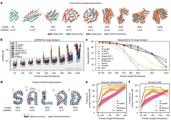 SALAD模型在主链生成质量评估中表现出色(图3a-c),其VP模型在50-400残基范围内与先进模型相当,而VP缩放和VE模型能有效生成长达1000残基的可设计主链(设计能力最高达36.7%)。通过形状噪声初始化(图3d),模型可生成特定形状(如字母)的高质量主链。在多样性方面(图3e,f),其可设计结构的多样性与RFdiffusion相当,并在大蛋白上超越Genie 2。