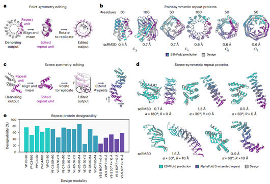 通过结构编辑结合对称化操作(图5a,c),作者的模型成功生成点对称(如循环对称)与螺旋对称的重复蛋白(图5b,d)。生成的主链具有低scRMSD和结构多样性(全α至全β拓扑),经ProteinMPNN设计后即使扩展3倍重复数仍能保持结构稳定性(图5e)。设计成功率受对称参数(如半径、旋转角)影响,紧凑结构(如小半径)会降低设计能力,证明该方法可灵活生成几何可控的重复蛋白。