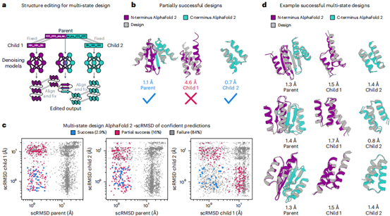 通过结构编辑耦合多个去噪过程(图6a),作者成功解决了多态蛋白设计任务:生成的主链-序列对在母体与子体状态间实现构象转换(β折叠→α螺旋)。其中2.9%的主链完全满足设计标准(AlphaFold RMSD<3.0 Å,pLDDT>75),成功率较ProteinGenerator提升6倍(图6b,d)。仅使用二级结构条件化时成功率降至0.4%,证明结构编辑是性能提升的关键。该工作首次实现了基于主链去噪模型的多态设计。