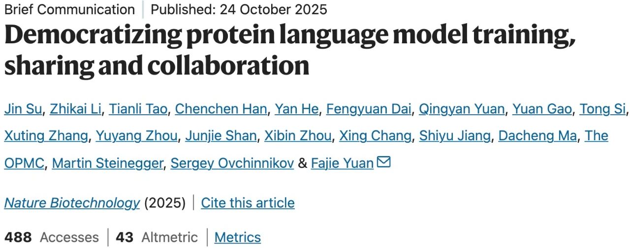 这项研究成果已于近期发表在国际顶尖期刊《自然・生物技术》(Nature Biotechnology)上,论文题为《Democratizing Protein Language Model Training, Sharing and Collaboration》。