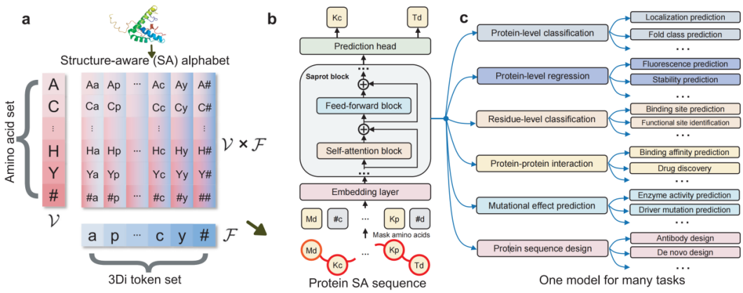 为了打破这一壁垒,西湖大学原发杰团队首先提出了一种新颖的蛋白质表征方法 —— 将蛋白质一维序列与三维结构相结合形成「结构感知」词汇表并据此训练出了蛋白质语言大模型 Saprot。