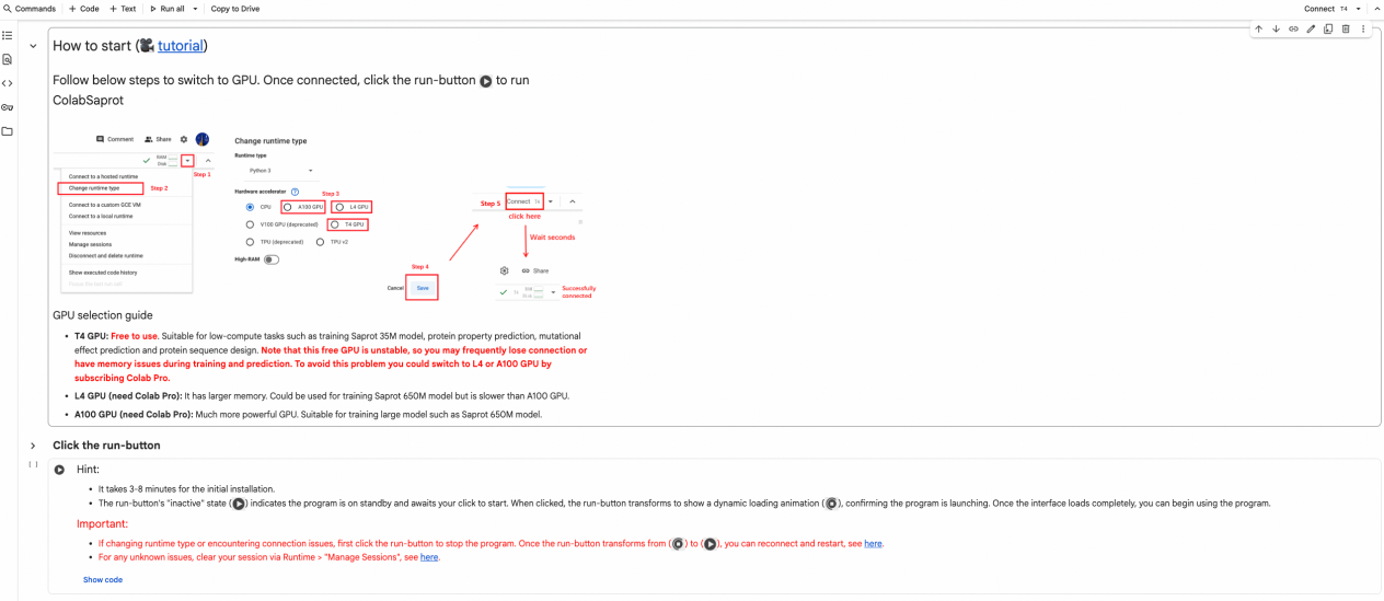 图 2. ColabSaprot 在线平台,具备细致的操作介绍以及简易的使用步骤