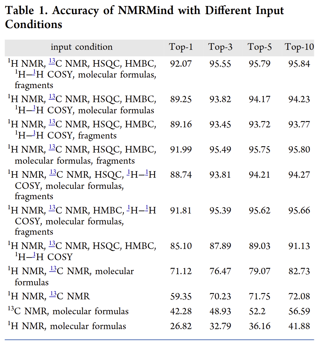 研究表明,NMRMind在多种输入条件下均表现出极高的准确性。如表1所示,在输入完整多维NMR数据时,其Top-1结构准确率高达92.07%,且单次解析耗时不足0.05秒。即便仅使用NMR谱图(不提供分子式),其准确率仍保持在85.10%的高水平。