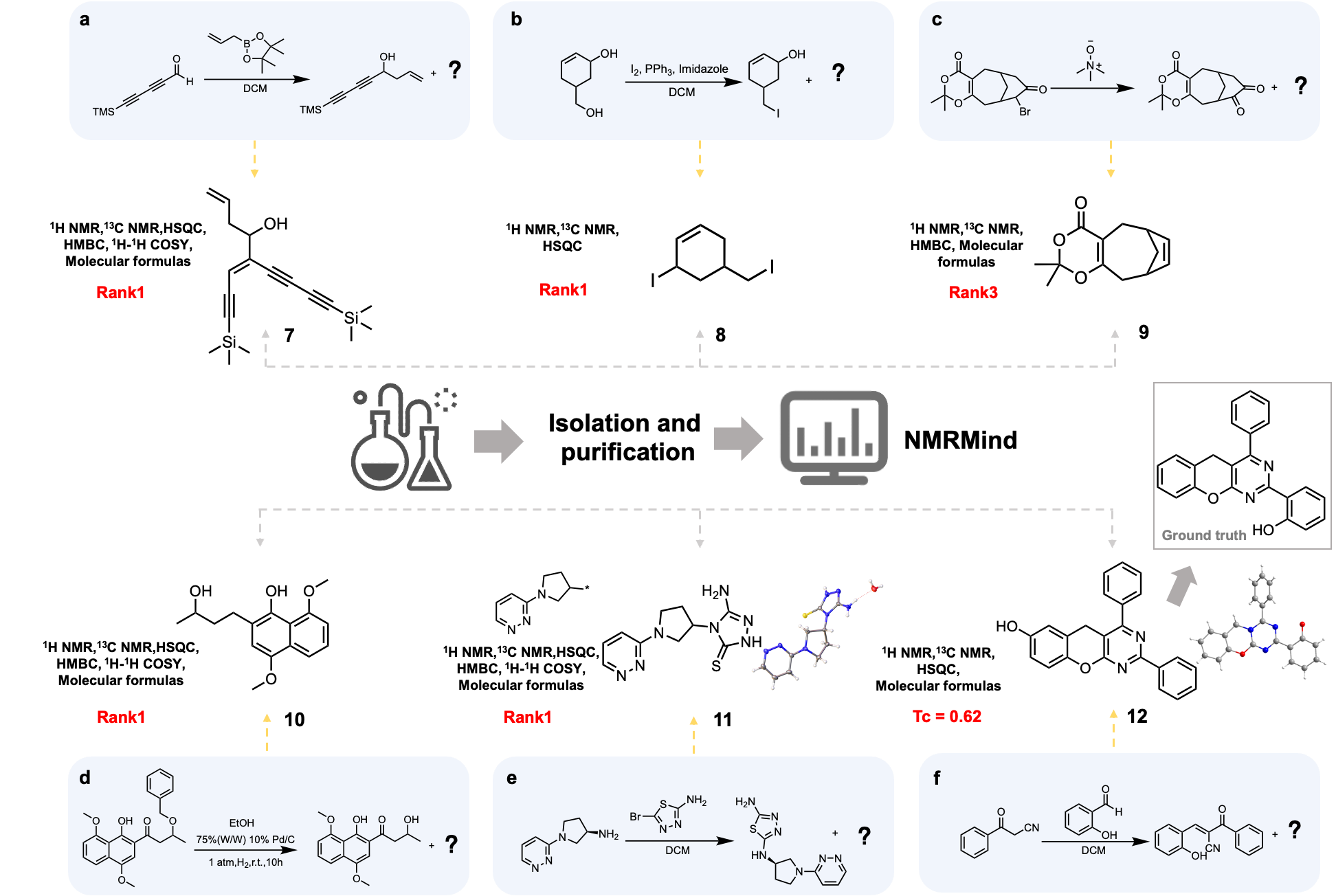 图3. NMRMind迅速识别出由六个有机反应(a-f)产生的意外产物。
