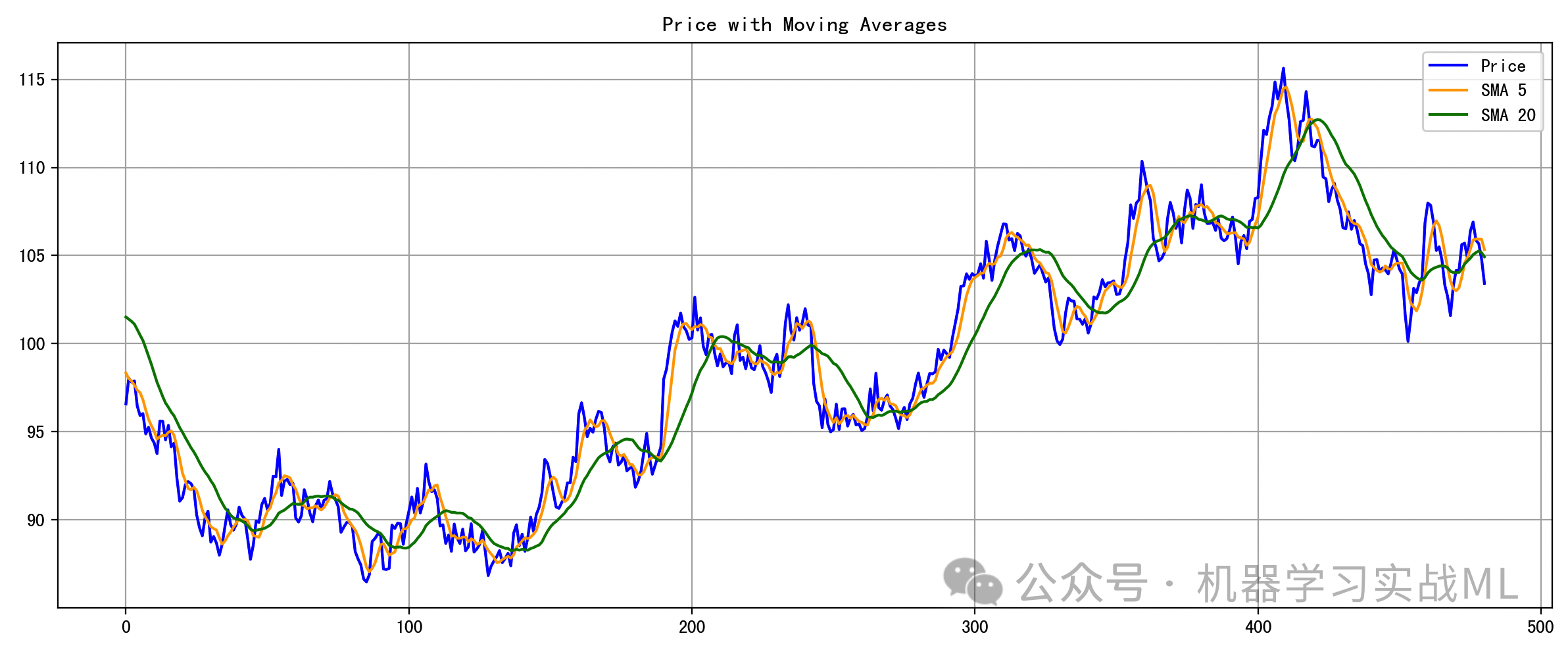 展示模拟市场价格随时间的波动情况,显示技术指标对趋势的平滑作用,LSTM 主要就是要学这种趋势结构。