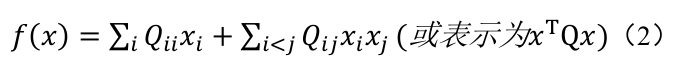 · Q 是一个对称的 N ∗N 维实数矩阵 (N 为变量个数),通常被称为 QUBO 矩阵。其对角线元素Qii对应于目标函数中与单个变量xi相关的线性权重 (或称偏置项),而非对角线元素 Qij则对应于不同变量 xi和xj之间相互作用 (或称耦合关系) 的二次项权重。