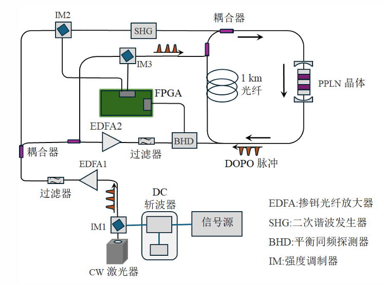 一种重要的物理实现是基于简并光学参量振荡器 (DOPO) 阵列构建的 CIM。其工作过程如下,超快激光器产生脉冲序列 (每个脉冲对应一个量子比特),经强度、相位等调校后,进入简并光学参量振荡过程,产生相应数量的 DOPO 脉冲。此时,腔中的循环脉冲相同且互不干扰,每个脉冲处于相位 0 和 π 的叠加态 (即量子态)。接着,通过分光器将部分光脉冲引导至电子学控制部分,利用零差测量 (BHD) 技术测量 OPO 脉冲的相位。外部输入的待求解 QUBO 问题的系数矩阵 (即 Q 矩阵) 与这些相位测量结果进行运算 (如矩阵乘法)。运算结果经适当延迟后,通过光学调制器将调控信号反馈注入光路系统,精确地实现脉冲间的耦合作用,从而构建起一个模拟目标伊辛模型的 N ∗N 耦合网络。这个过程不断循环迭代,系统状态持续演化。