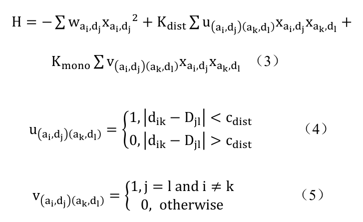 其中,wai, dj为原子 ai放置在格点dj上的适配度,Kdist、 Kmono、cdist为模型三个可调参数。通过 CIM 求解上述伊辛模型可得到配体对接构象。