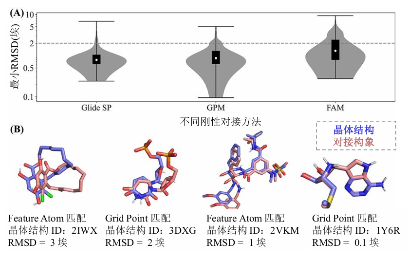 图 7-1 (A) 为 Glide SP、GPM 和 FAM 采样构象中最小 RMSD (mRMSD) 的分布,灰色虚线表示高质量对接阈值 ((<2 \AA)) 。图 7-2 (B) 为采样的对接构象 (红色) 与晶体结构 (蓝色) 中的构象比较示例。