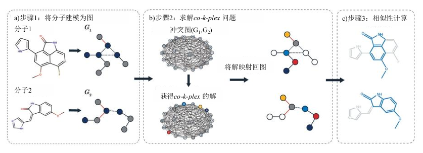 分子相似性 (molecular similarity) 是化学分子间的重要比较信息,相似性原理指出,总体相似的分子应具有相似的生物活性,分子相似性应用广泛,包括靶标预测、结合姿态预测、毒性预测、挖掘靶标与药物数据关联、虚拟筛选等。现有方法主要利用分子指纹的表征方式进行相似性计算,但其只考虑二维的原子及官能团排布,忽略了分子中不同原子的空间位置关系,这些构效关系对于分子与蛋白的结合至关重要。Maritza Hernandez 等提出了基于图论方法解决分子相似性计算中的原子匹配问题,如图 7-2 所示,通过构建冲突图 conflict graph 并添加相关约束构建 QUBO/Ising 模型,并使用 QA 在小规模上数据上进行了验证。上述模型在 CIM 上可同样求解,在 CIM 大比特数以及全连接特性下,能解决更复杂的分子匹配问题。