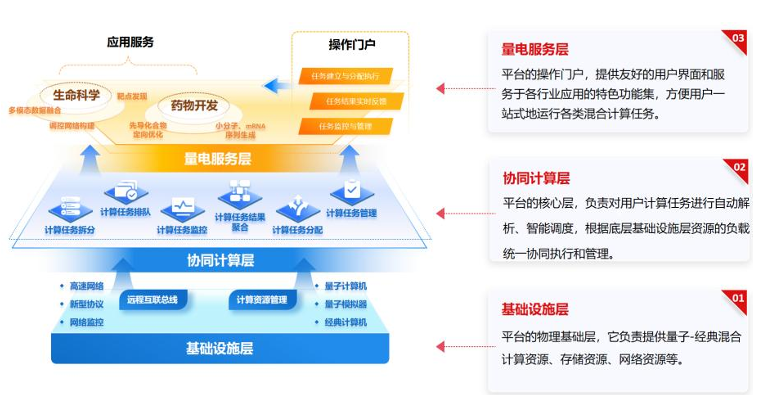 平台的技术优势在于突破传统计算瓶颈,高效求解生物制药复杂问题。平台可智能解析量电融合计算任务并高效分配至光量子计算机、超导量子计算机、经典计算机、量子计算模拟器等异构计算资源,支持用户便捷提交任务、动态优化资源分配,实时监控混合任务执行状态,提升计算效率。量子计算在组合优化和概率分布采样问题上具有显著速度和精度优势,经典计算的稳定性则确保平台在实际应用中的可靠性和可扩展性。平台还具备高度灵活性和可定制性,可根据不同研发需求进行个性化配置。平台适配多种异构硬件架构,包括经典电子计算、多类型量子计算机及混合计算环境,可满足不同场景需求。