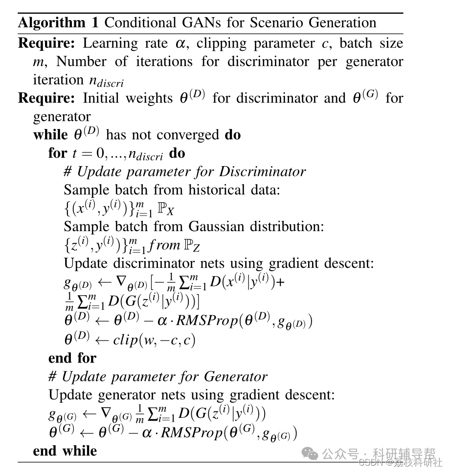 在每个训练时期,生成器更新其权重以生成“假”样本,试图“欺骗”鉴别器网络,而鉴别器试图区分真实历史样本和生成的样本之间的差异。理论上,在达到纳什均衡时,GAN的最优解将为我们提供一个生成器,该生成器可以准确地恢复真实数据的分布,因此鉴别器将无法区分样本是来自生成器还是来自历史训练数据。此时,生成的场景与真实历史数据无法区分,因此尽可能真实。图2显示了我们特定环境下GAN培训程序的总体架构。