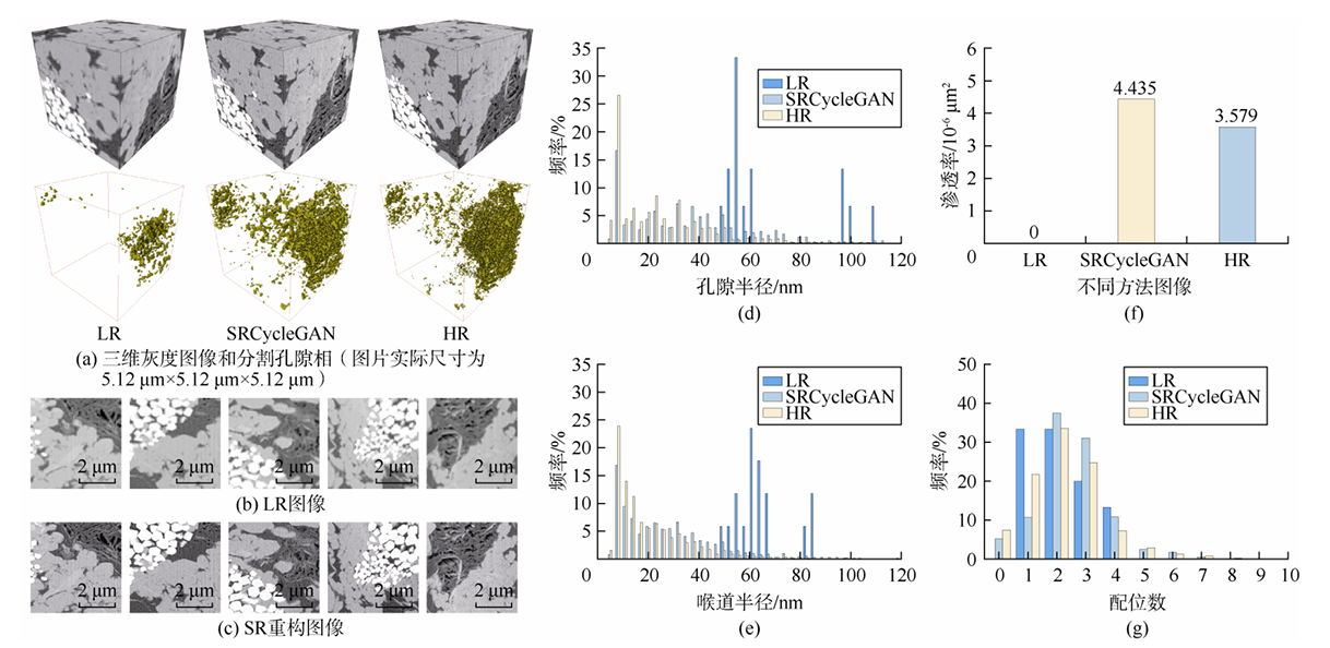 关键突破:不仅能降噪、去模糊,还能重构 LR 图像中丢失的纳米级孔隙 —— 例如 40nm / 像素的 LR 图像经处理后,能清晰显示原本不可见的 10nm 级有机质孔隙,孔隙数量从 15 个 / 视域增至 2052 个 / 视域。