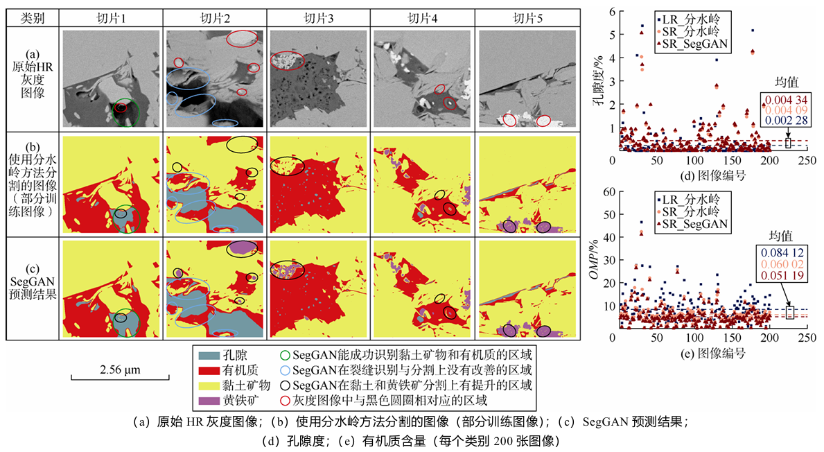 精度提升:对孔隙、有机质、黏土的分割交并比(IoU)均超 0.75,尤其能精准识别有机质中的黏土条带 —— 传统方法误判率超 25%,而 SegGAN 误判率降至 5% 以下,还能自动检出分水岭算法遗漏的黄铁矿颗粒。