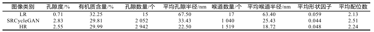 表1 LR图像、SRCycleGAN超分结果与真实HR图像的孔隙结构参数对比表