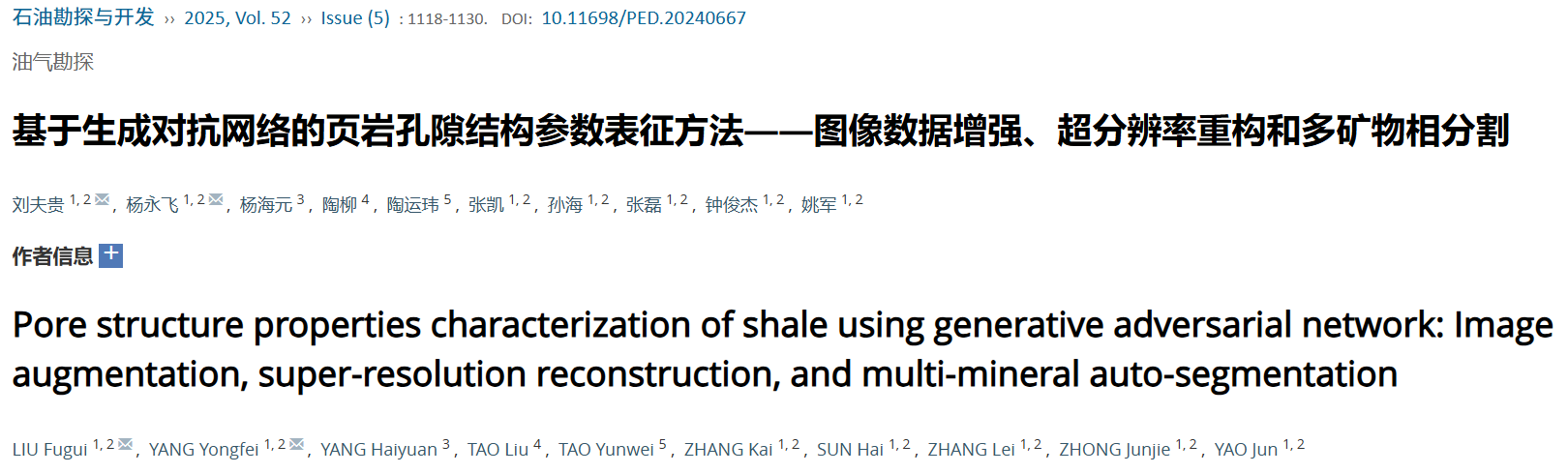 中国石油大学(华东)团队在《石油勘探与开发》2025年5期发表《 基于生成对抗网络的页岩孔隙结构参数表征方法 —— 图像数据增强、超分辨率重构和多矿物相分割 》,提出 GAN 综合框架。其用tyleGAN2-ADA仅100张HR图生成海量逼真HR图;SRCycleGAN无成对数据将三维数字岩心精度提8倍,孔隙数从15个/视域增至2052个;SegGAN自动分割矿物,IoU超0.75,黄铁矿识别率从30%升90%。在四川盆地页岩验证,超分后孔隙度、渗透率与真实HR数据偏差<8%,还适用于碳酸盐岩等,降勘探成本70%