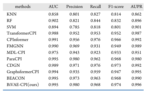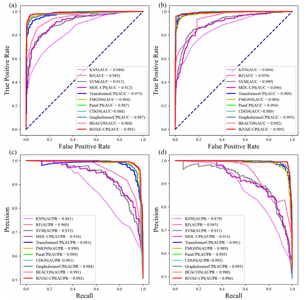 当正负样本比例为 1:5(真实场景常见)时,BiVAE-CPI 的 AUPR 在 Human 数据集提升 4.0%-36.2%,在 C. elegans 数据集提升 3.4%-34.9%,远优于其他模型,解决了传统方法 “偏向多数类” 的痛点。