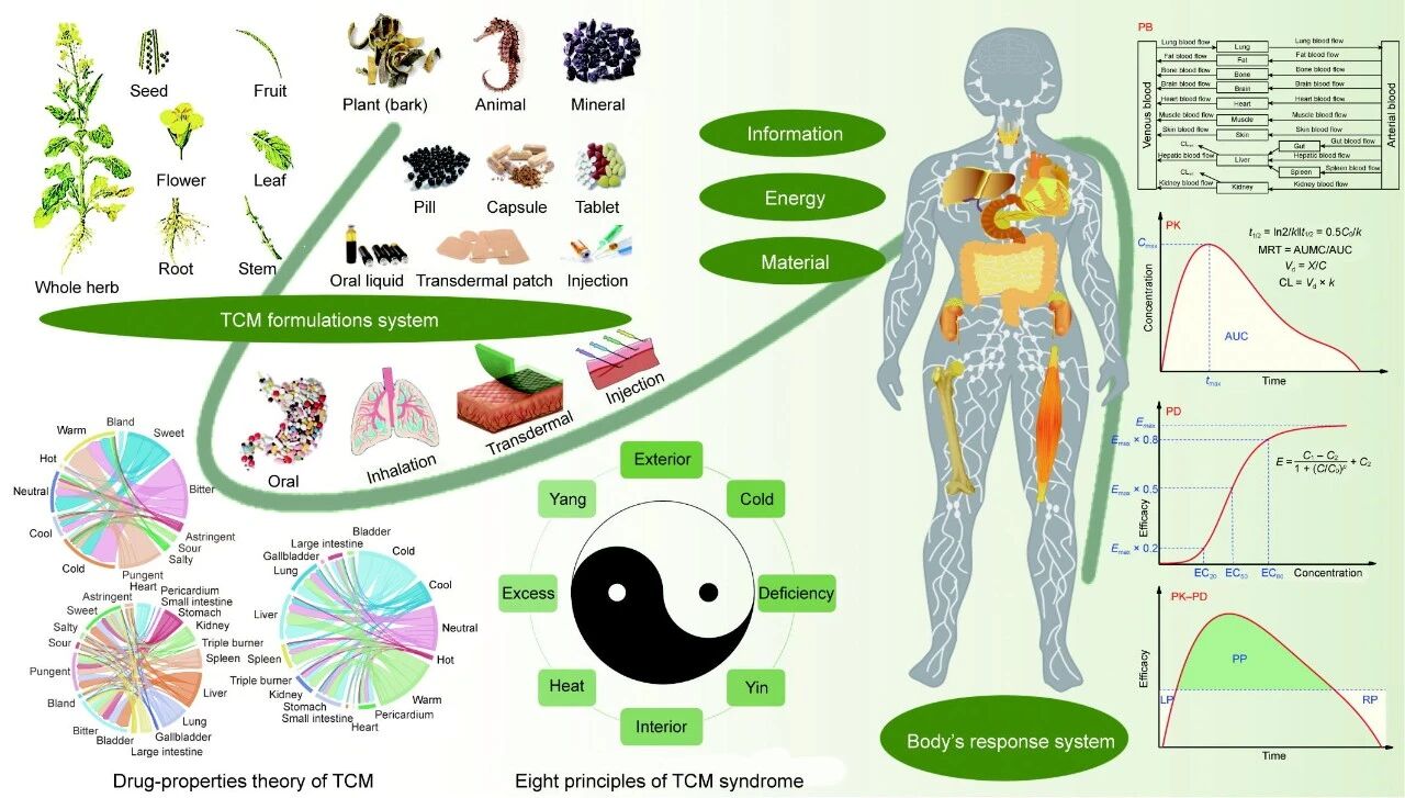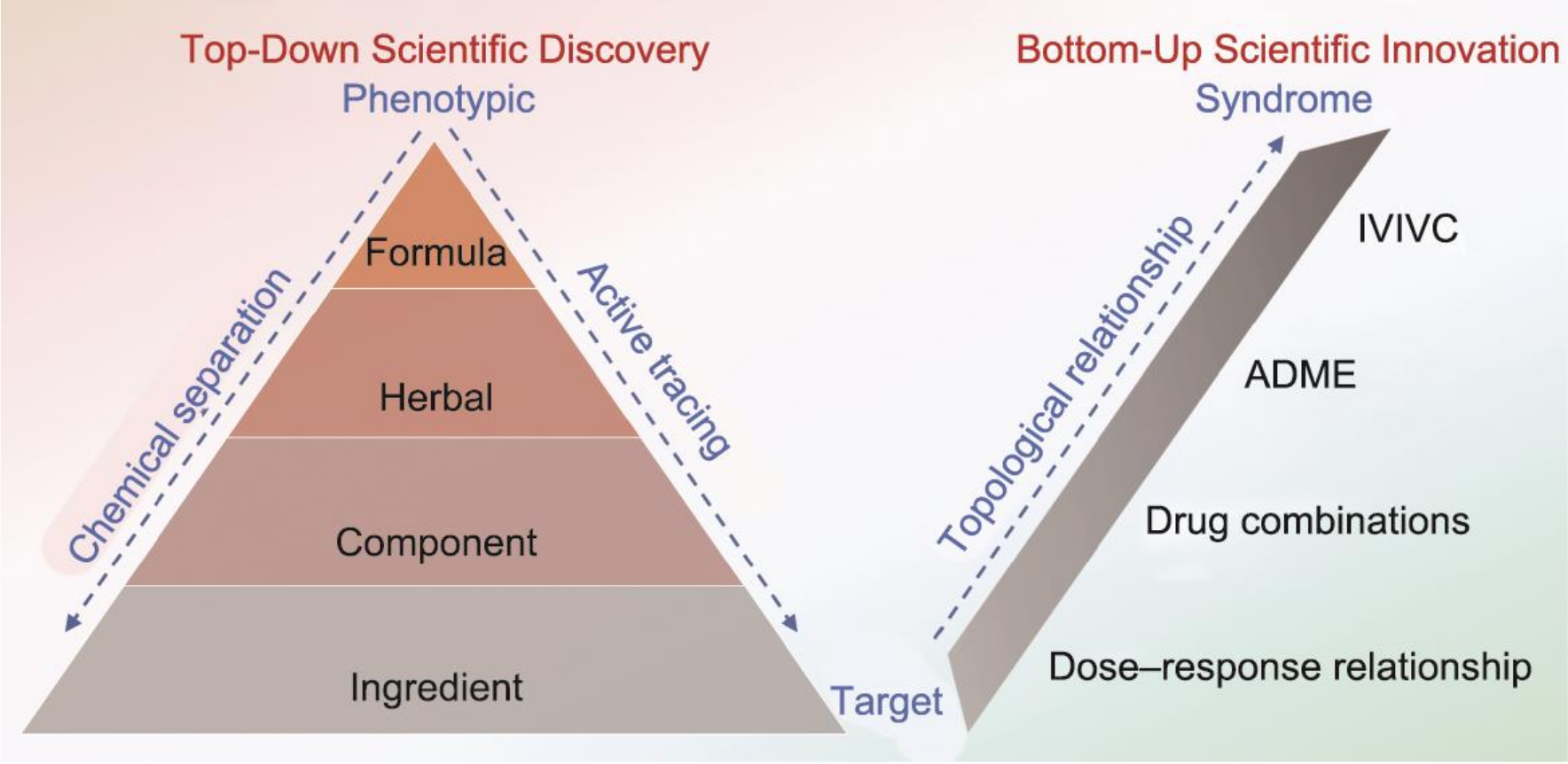 在中医药整体物质基础的复杂性解析方面,研究指出,中医药物质基础研究需关注生物碱、苷类、多糖等生物活性化合物的物理化学性质、分子间相互作用及对人体药代动力学(PK)和药效动力学(PD)的整体影响。自上而下的研究方法从方剂效应出发,通过代谢组学、基因表达谱分析等技术分离活性成分,如免疫亲和色谱可选择性去除中药配方中多种成分;自下而上的方法则借助生物信息学构建 “成分–靶点–疾病” 框架,利用分子对接预测活性成分作用机制,依托 CPMCP、SymMap、TCMSP 等数据库及网络药理学,深入理解中药整体疗效,但也面临数据简化、靶点检测受限等挑战。