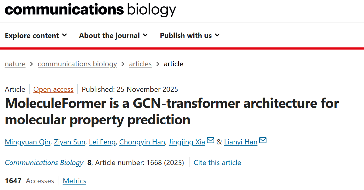 2025年11月25日,复旦大学韩涟漪、夏晶晶团队在《Communications Biology》期刊上发表研究论文,题为“MoleculeFormer is a GCN-transformer architecture for molecular property prediction”。该研究提出了一种基于GCN-Transformer架构的多尺度特征融合模型MoleculeFormer。在覆盖28个数据集上的实验结果表明,该模型在多种药物发现任务中均表现出稳健性能,包括药物疗效/毒性预测、表型筛选以及ADME评估。
