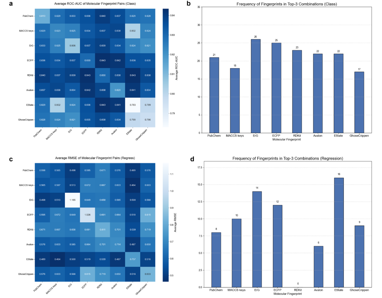 实验结果(图2)表明,不同单一分子指纹在不同预测任务中的性能差异显著。在分类任务中,ECFP指纹和RDKit指纹表现最为突出。在回归任务中,MACCS keys指纹表现最佳。值得注意的是,EState指纹在单一分子指纹设置下整体表现相对较弱,在分类和回归任务中分别排名第四和最后,表现均劣于其他指纹;然而,在组合使用时却展现出优异性能,这反映了指纹特征互补性的重要作用。此外,RDKit指纹在回归任务中表现出一定的干扰效应,对模型性能产生负面影响。
