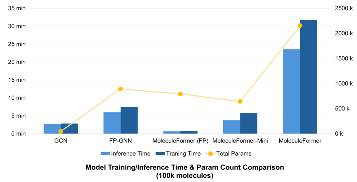 图3展示了在输入10万个包含三维结构信息的小分子后,不同模型在训练与推理阶段所需的时间以及对应的参数规模。MoleculeFormer(FP)直接利用分子指纹进行全连接编码,因此其训练和推理速度相对较快。MoleculeFormer-Mini版本进一步移除了EGNN模块,在显著降低训练时间的同时,保留了GCN与Transformer的核心结构,从而在效率与性能之间取得了较好的平衡。