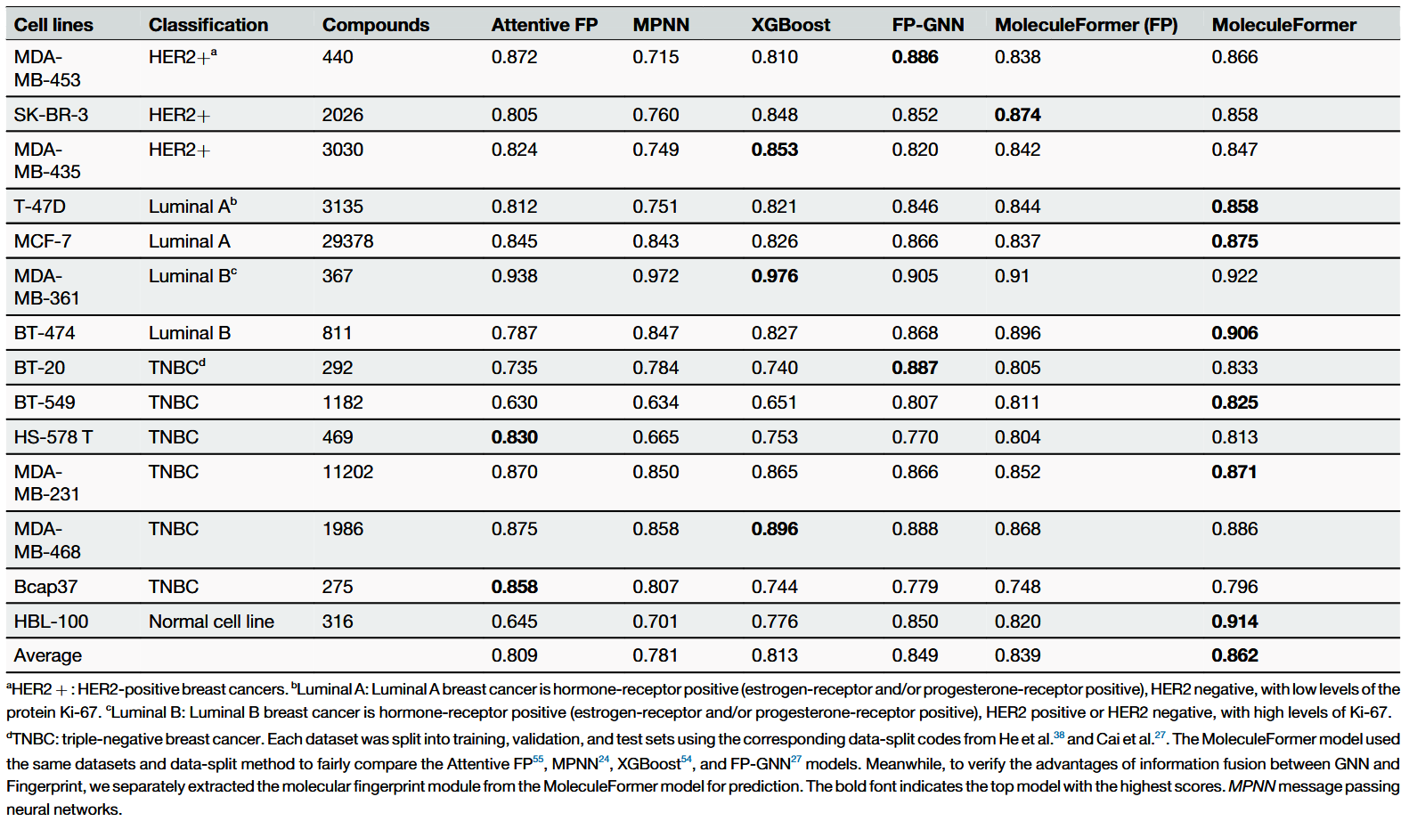 为评估MoleculeFormer是否能够捕获药物的整体效应,并有效反映其对真实细胞体系的综合影响,研究进一步在一个化合物–乳腺癌细胞表型筛选数据集上开展了实验。如表2所示,各细胞系中性能最优的模型结果以粗体标示。MoleculeFormer在所有细胞系上的平均ROC-AUC得分均为最高,表明其在细胞表型预测任务中具备极具竞争力的预测精度。