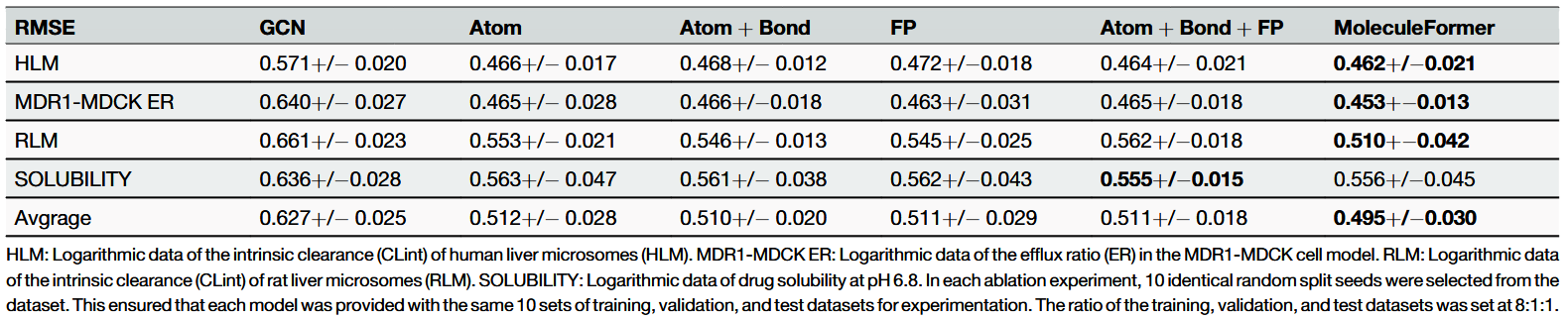 本研究采用Wu等人提出的公共基准数据集,对MoleculeFormer在10个广泛使用的药物性质预测基准数据集上的性能进行了系统评估。如表1所示,MoleculeFormer在13项任务中取得了最佳的平均性能,充分验证了其有效性。