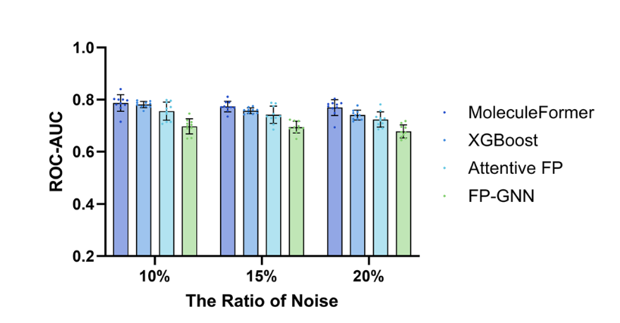 在HIV数据集上,研究对MoleculeFormer的抗噪声能力进行了系统评估。具体而言,在训练集和验证集中人为反转一定比例的标签,并在10个不同的随机种子下重复实验。图4的结果表明,随着噪声比例的增加,MoleculeFormer依然能够保持相对稳定的性能,展现出卓越的抗噪声鲁棒性,说明其在低质量数据集条件下仍能保持良好的性能。