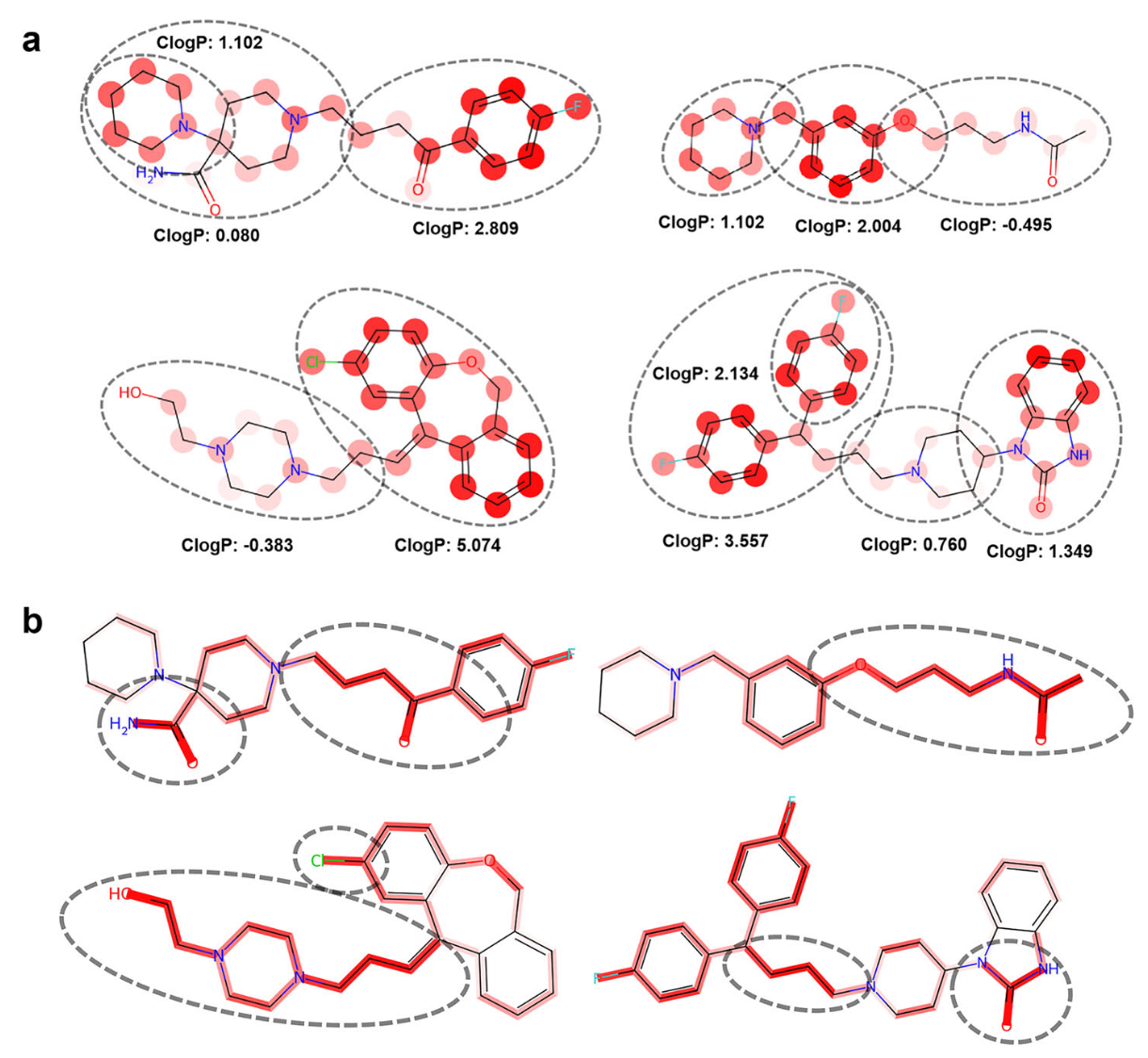 为进一步探究模型的可解释性,每个分子被划分为两个结构片段,并分别计算其cLogP值。同时,对Transformer层中的注意力权重进行可视化分析,其中颜色深浅表示各原子所分配的注意力权重,颜色越深代表权重越高。结果显示,模型在cLogP值较高的区域分配了更多注意力(图5a)。此外,键图表示更倾向于关注分子中的极性基团,从而对氢键供体(HBD)特性产生显著影响;相较之下,碳链结构通常具有较低的三维刚性,更有利于分子通过血脑屏障(BBB)的孔径限制(图5b)。