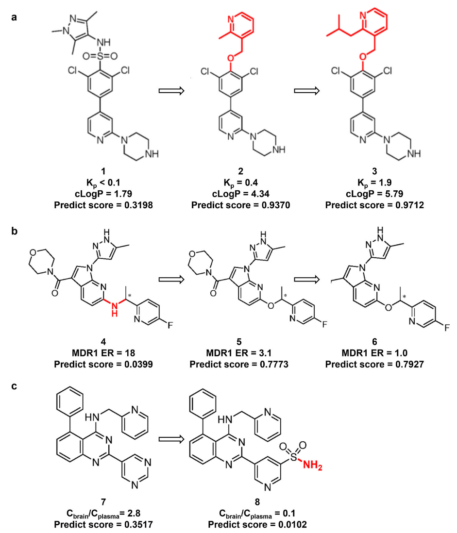 在具体案例分析中,Brand等人对BBB渗透性较差的化合物1进行了两轮优化,较高的Kp和cLogP值表示更强的BBB渗透能力(图6a)。Fushimi等人对BBB渗透性较差的化合物4同样进行了两轮优化。MDR1(P-糖蛋白)是BBB中的一种转运蛋白,能够主动将药物外排,从而降低其进入大脑的能力,MDR1水平越低,BBB渗透性越强(图6b)。Gunaga等人通过结构修饰降低了原本具有较高BBB穿透风险的化合物7的风险,较低的C_brain/C_plasma比值表示更弱的BBB渗透能力(图6c)。在上述案例中,MoleculeFormer的预测结果均与实际实验结果保持一致。
