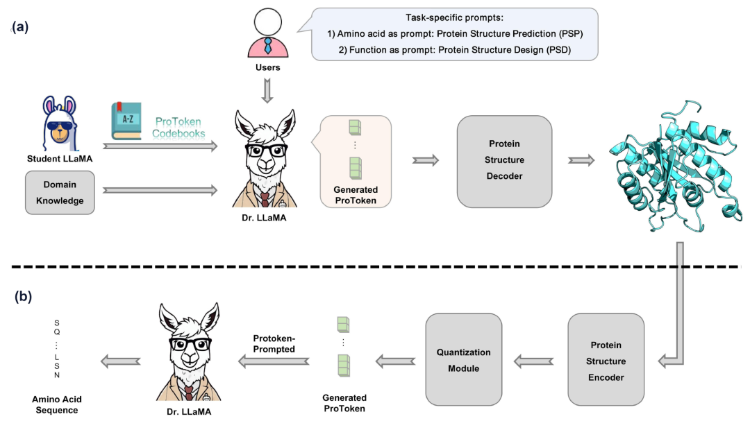 图2 基于大语言模型的ProTokens示意图. (a) 解码器功能: 配备解码器的Dr. LLaMA能够以ProTokens形式生成蛋白质3D结构, 既可根据指定的氨基酸序列提示进行结构预测, 也可根据功能需求提示完成结构设计. (b) 编码器功能: 配备编码器的Dr. LLaMA能对蛋白质主链进行逆向折叠, 推导出对应的氨基酸序列