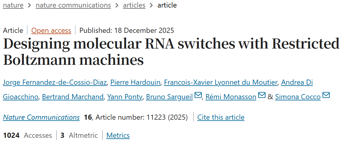 多国联合团队2025年在 Nature Communications 发表的《 Designing molecular RNA switches with Restricted Boltzmann machines 》提出基于受限玻尔兹曼机(RBM)的 RNA 开关设计方法。RBM 从天然 SAM-I 核糖开关序列中学习规律,生成 476 条人工序列,部分与天然序列差异达 40%。经 SHAPE 和 DMS 实验验证,RBM 高评分(>300)序列对 SAM 的结构开关响应成功率达 35%,且能建模假结等关键三级结构。该方法还适配环二腺苷酸等其他核糖开关家族,为合成生物学调控工具开发提供新路径。