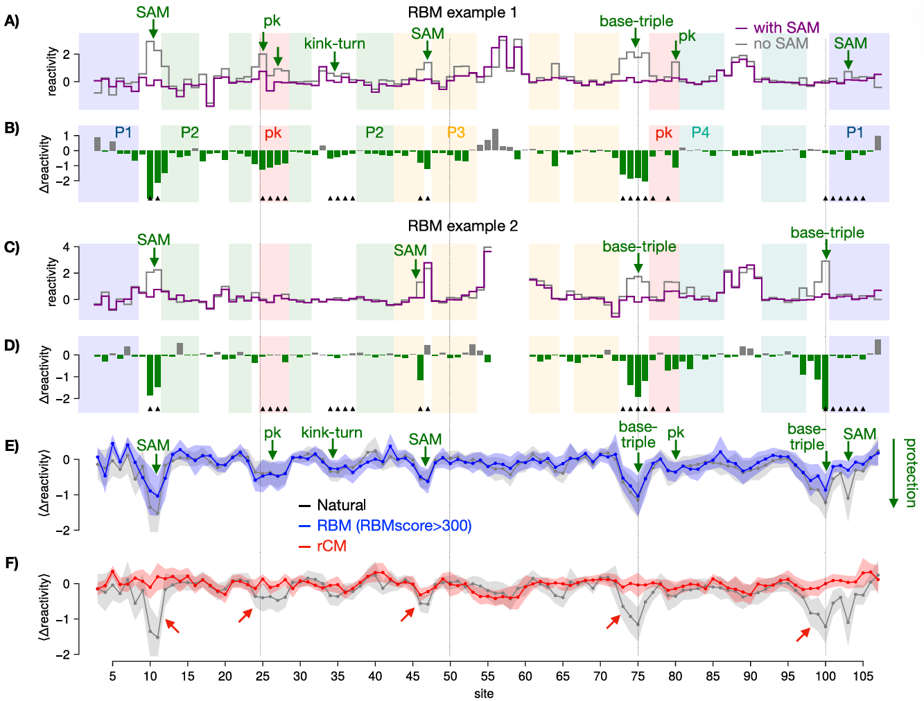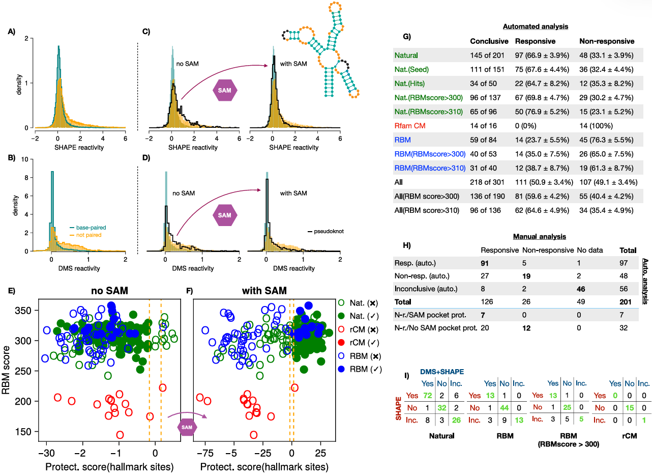 高评分的人工 RNA 序列(RBM 分数 > 300)与天然序列表现出高度相似的保护模式 —— 结合 SAM 后,假结区(25-28 位、77-80 位)、SAM 结合位点(10 位、11 位等)的反应活性显著下降,证明其成功折叠为闭合构象;