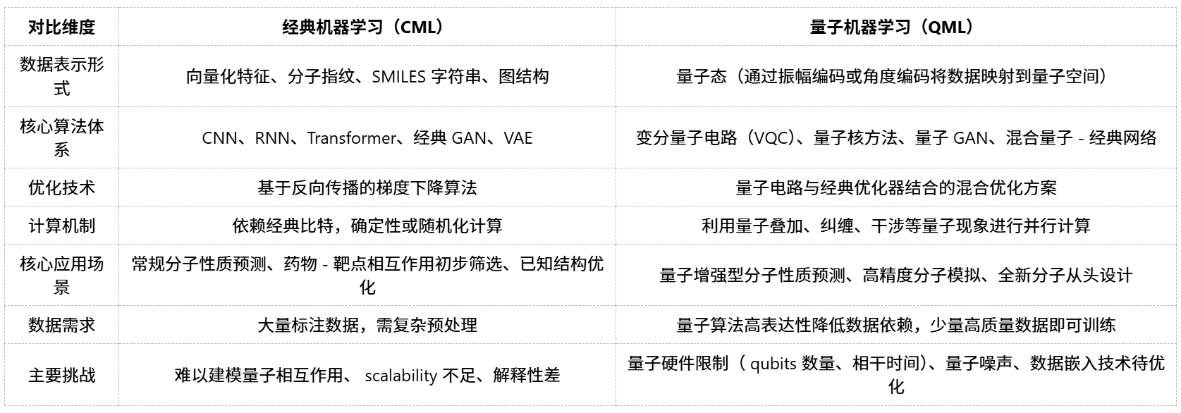在药物研发的核心环节中,经典机器学习(CML)虽已广泛应用,但始终难以突破自身局限,而 QML 的独特机制恰好精准适配这些痛点: