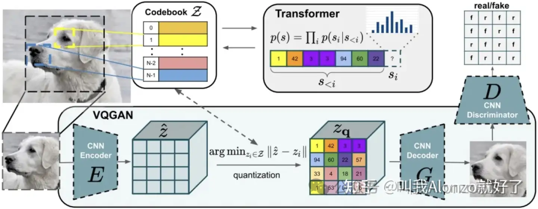 于是,这篇工作提出先用一个VQ-VAE把高维像素图压缩成低维的离散码本(codebook),再让Transformer在这个空间分辨率被压缩的隐空间里去预测下一个 token。这里的VQ指的是Vector Quantized——向量量化,顾名思义,编码出来的是一个离散的VAE表征,也就天然跟Transformer预测离散序列的特征能够匹配上了。这样一来,我们不再需要压缩一个RGB图像的所有像素,而是只需要压缩这个紧凑的latent表征即可。