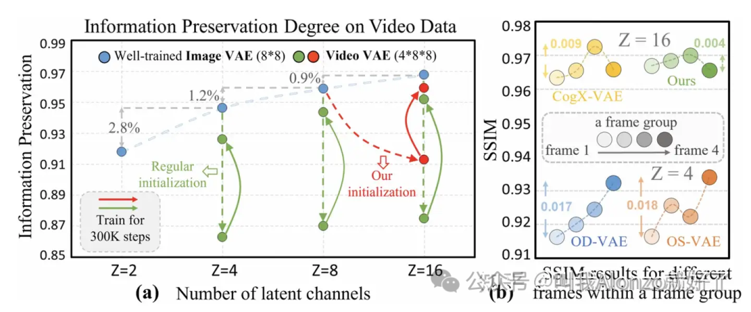 IV-VAE出自《Improved Video VAE for Latent Video Diffusion Model》一文,发表于CVPR 2025。这篇工作重点解决了的是3D VAE的训练退化问题,即直接利用2D VAE权重初始化 3D VAE 时,网络倾向于退化为逐帧处理模式,导致时间维度的压缩能力失效,且在同一视频序列内,首帧与后续帧的重建质量会出现显著的不平衡。
