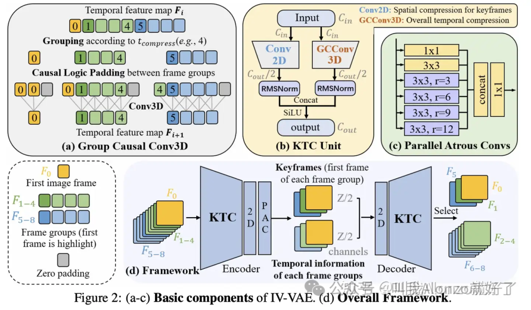 为此,IV-VAE 提出了 「关键帧时间压缩」 配合 「分组因果卷积」 的策略。它将输入的一个视频序列在通道维度上拆分为两个分支:一半通道作为 「关键帧分支」,继承2D VAE的空间域信息压缩先验,确保纹理清晰度;另一半通道作为 「时序分支」,通过3D分组因果卷积,负责捕捉时间维度的变化。这种设计既保留了高频空间域信息细节,又有效建立了视频帧之间的因果依赖。