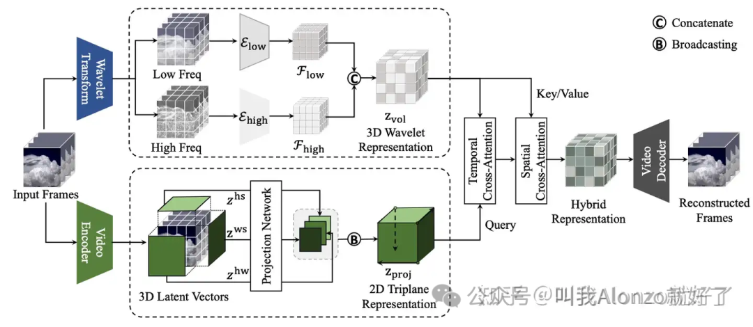 HVDM出自《Hybrid Video Diffusion Model》一文中,目前已代表于ECCV 2024上。它的混合VAE采用了三个维度的信息解耦:2D的映射隐空间变量,用于提取空间域的全局上下文;3D卷积配合小波分解的设计,主要用于提取局部时空体积信息;频域隐空间变量,旨在提升空间域的纹理细节,提升重建质量。下游任务的选定也是主要针对长视频生成、图生视频,以及大运动动态的一些场景,动机也比较合理,在这些场景中视频序列的编码问题基本上可以看作是复合的空间域细节和时序保真。