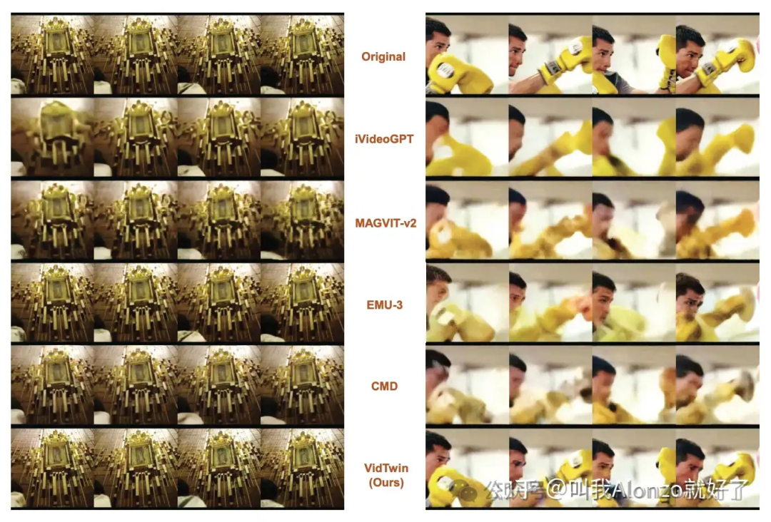 在快速运动的一些场景上,实验结果也证明了VidTwin这种设计的有效性。