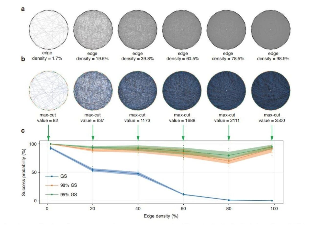 研究的关键突破在于采用飞秒激光泵浦技术构建相干光量子计算系统,并在光学设计与结构稳定性上进行了协同优化。这种飞秒脉冲具有极高峰值功率,不仅增强了非线性光学效应和量子行为表现,还降低了光纤系统中所需的平均泵浦功率,从而提升能效与系统可靠性。实验以包含100个顶点的莫比乌斯图(Möbius Ladder graph)为测试基准,成功实现了55%的平均最优解成功率,相比之前最好水平提升了2倍以上。同时该系统在连续8小时运行中保持了高成功率,充分验证了相干光量子计算机在长时间、高稳定性工业级应用场景中的可行性。