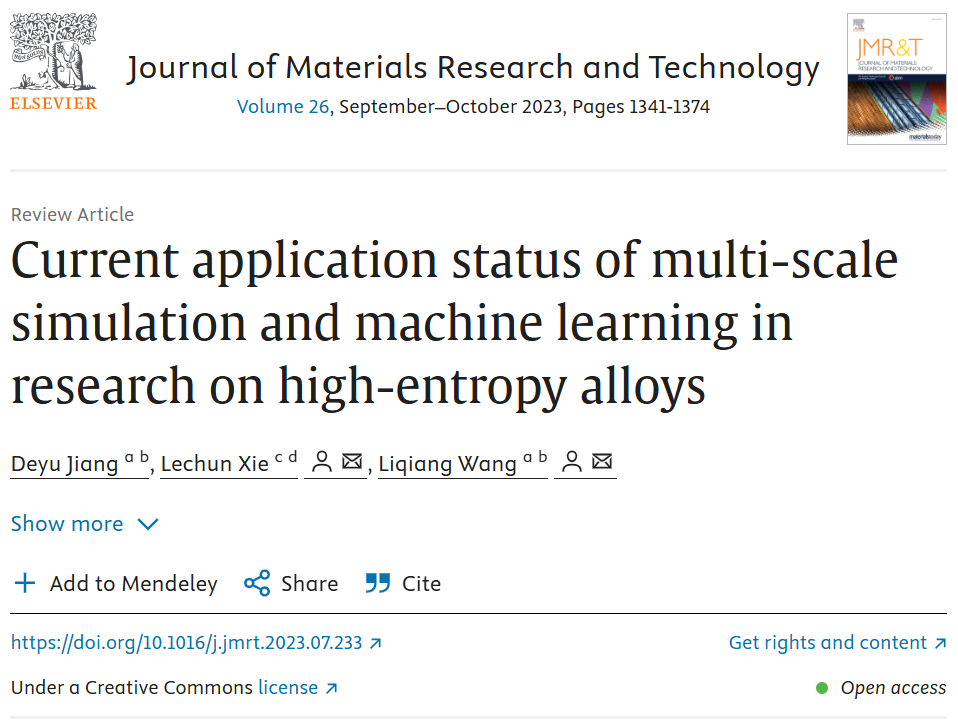 上海交通大学与武汉理工大学团队在《Journal of Materials Research and Technology》2023 年 26 期发表综述《Current application status of multi-scale simulation and machine learning in research on high-entropy alloys》。研究表明,第一性原理、分子动力学等多尺度模拟与机器学习结合,可高效解决高熵合金研发难题。机器学习预测单相固溶体形成准确率达 94.6%,设计的高硬度合金性能提升 24.8%;多尺度模拟可精准解析原子机理与宏观性能。该组合技术大幅缩短研发周期,为高熵合金在生物医疗、航空航天等领域的应用提供核心支撑。