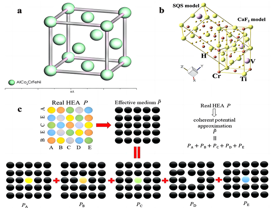 第一性原理计算:基于量子力学,精准模拟电子结构、结合能等核心参数,预测相稳定性与基本物理性质。通过 VCA、SQS、CPA 三种建模方法,可计算弹性常数、晶格常数等关键指标。