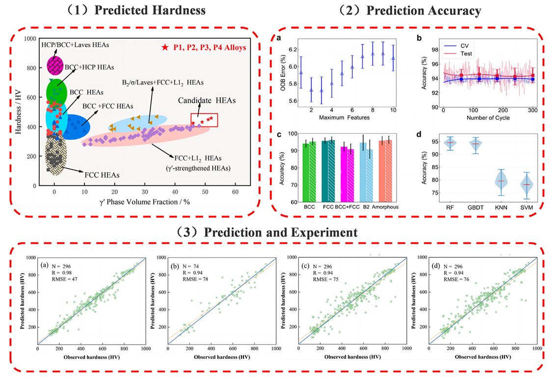 性能预测:基于实验与模拟数据,构建回归模型,快速预测硬度、强度、耐腐蚀性等关键性能。例如通过随机森林模型预测单相固溶体形成,准确率达 94.6%;